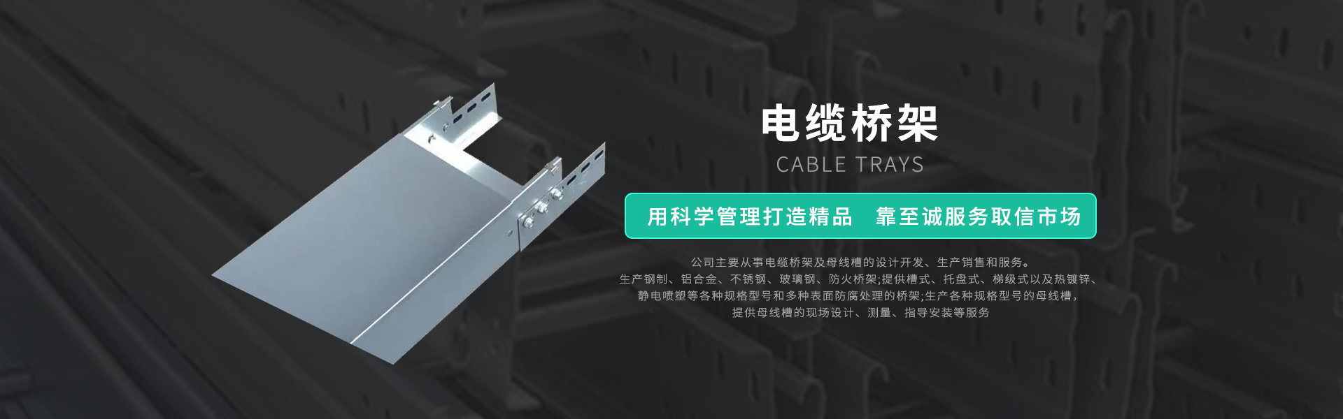公司主要从事电缆桥架及母线槽的设计开发、生产销售和服务。生产钢制、铝合金、不锈钢、玻璃钢、防火桥架;提供槽式、托盘式、梯级式以及热镀锌、静电喷塑等各种规格型号和多种表面防腐处理的桥架;生产各种规格型号的母线槽,提供母线槽的现场设计、测量、指导安装等服务。