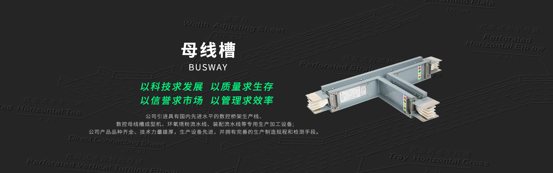 公司引进具有国内先进水平的数控桥架生产线、数控母线槽成型机、环氧喷粉流水线、装配流水线等专用生产加工设备。